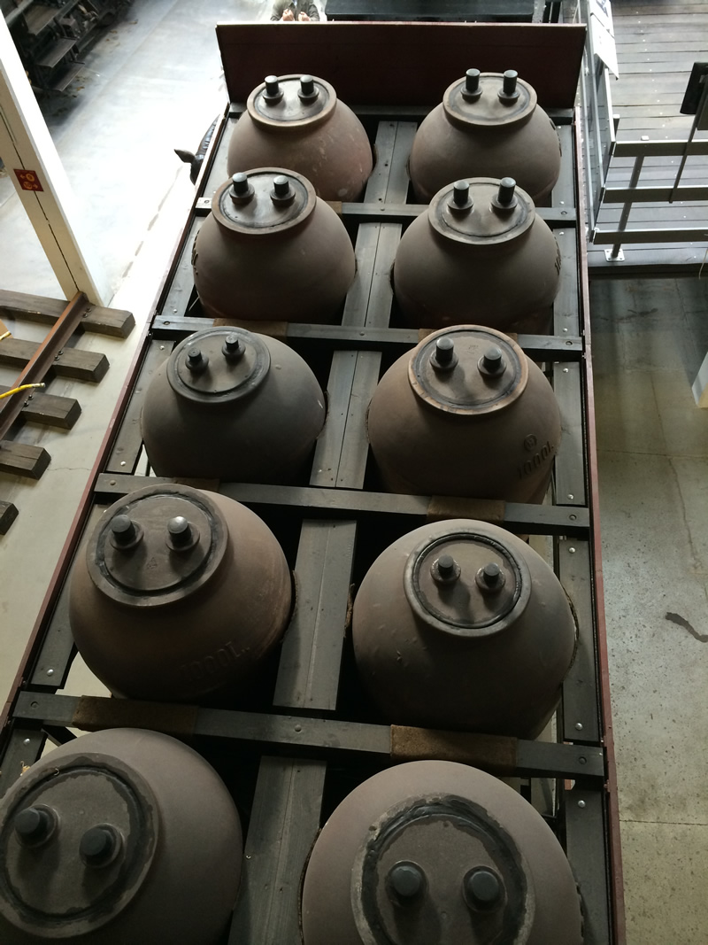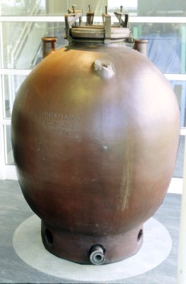 | Many industries rely on acids, and the ceramic jars used in transport are a special clay that is impervious to attack by these agents. The railway cars have a special framework to cradle the jars so they will not be damaged in transit. The jars are around 0.9 metres in diameter, and 1.8 metres tall. Each contains up to 900 litres with appropriately fitted lids. These jars would have to lifted by crane for loading and unloading. The acid jar shown below is a typical 200 gallon type, standing about five feet high. This example is preserved at 'Catalyst' the museum of Chemical Industry (Mersey Road, Widnes, Cheshire, WA8 0DF, UK). | ![]() |