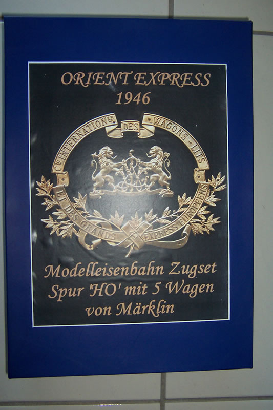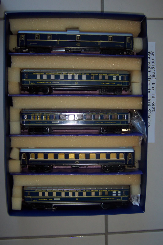These are privately boxed sets and do not represent any sets put into production. The contents are genuine Maerklin articles, some dating from the 1950's. All models are made of sheet metal, so I have assembled only those items that retain the uniform look and feel of what has been available in the past. There are currently no coaches of this type available from Maerklin. However, Rivarossi, France Trains and Jouef have all marketed genuinely good models of CIWL coaches in plastic. Because I run a Maerklin layout with some toy quality curves I needed to stick to Maerklin products for reliable running.