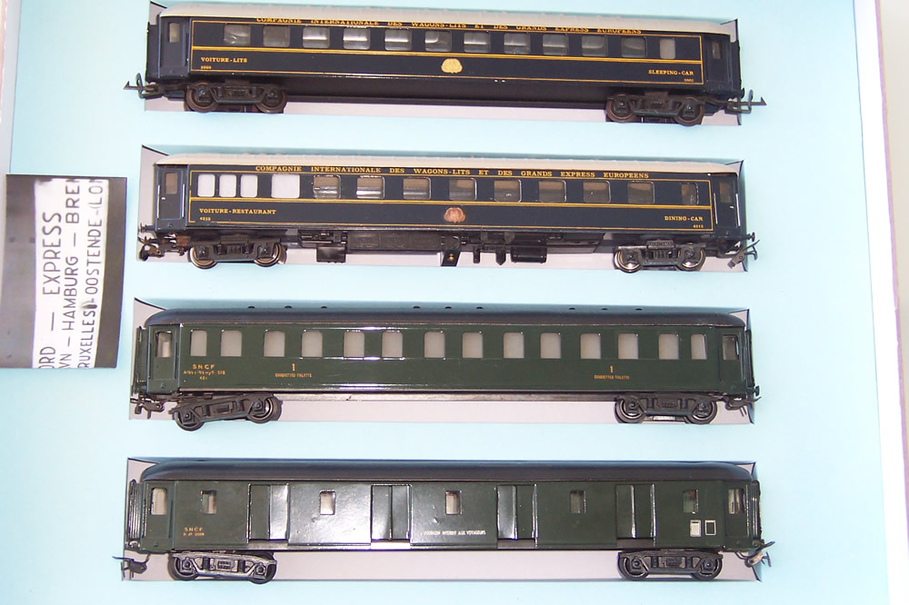 I can use Orient Express cars from my 1946 and 1959 boxed sets, and augment them with cars specifically collected for the Nord Express. To retain some uniformity with those sets, I collect models made of sheet metal, and invariably these will be models from a past era. I will add new acquisitions to this page as I locate them. This is in spite of the availability of many plastic model coaches of this type, from Rivarossi, LS Models and Jouef.