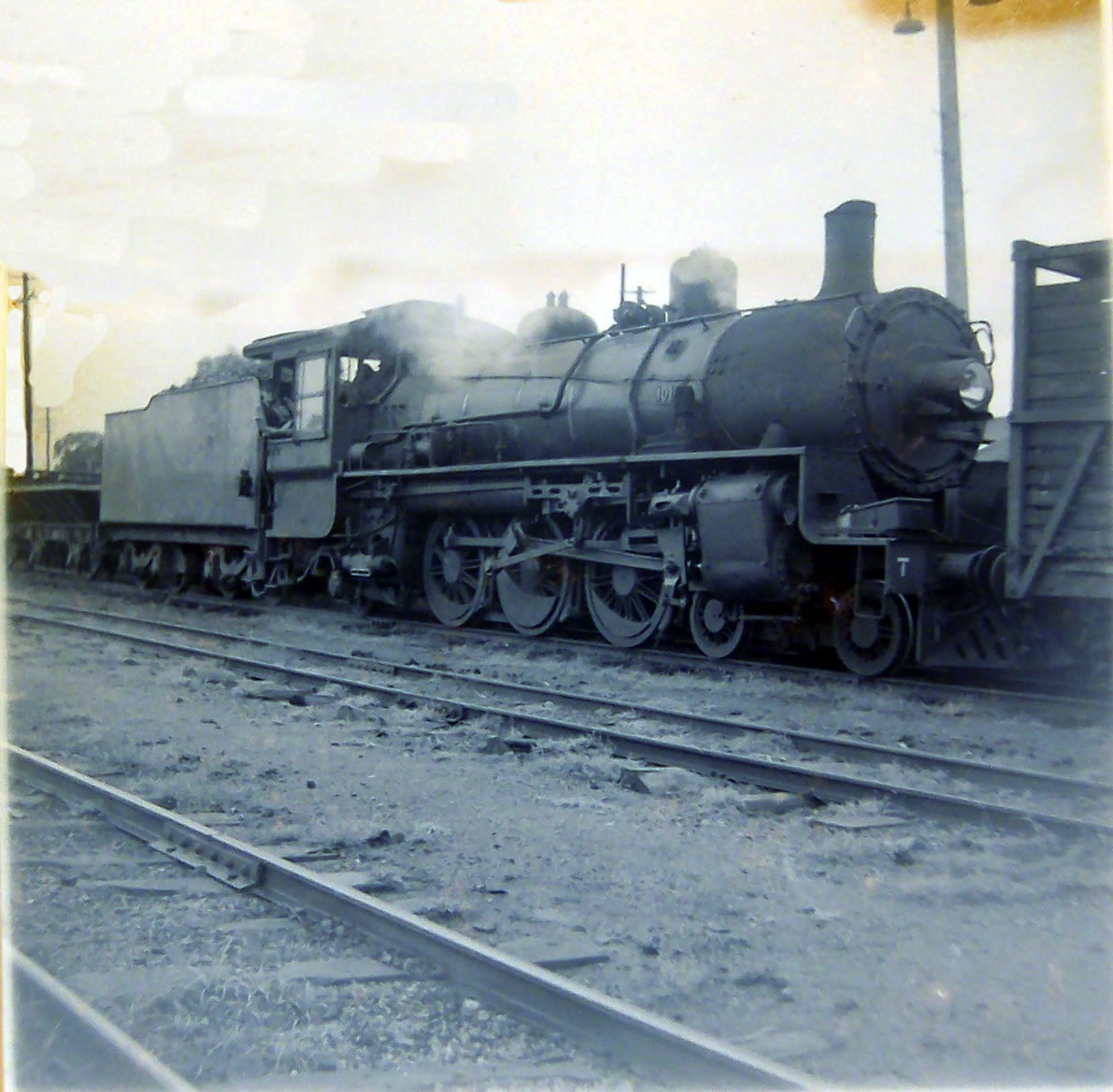 This photo shows the often typical duties undertaken by the BB18.1/4 class Pacific locomotives in their later years. This engine was one of the first of its class to arrive from England in 1951, and is here shunting stock wagons at the animal sale yards at Harristown 10 years later.