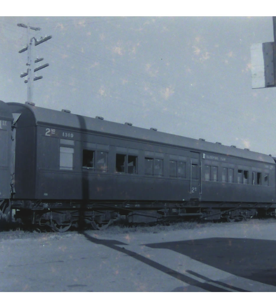 This 2nd class car is Number 1319, exterior of tuscan red, interior of polished Queensland maple and other local timbers. It had match-board sides, electric lighting, and 3 bunks, one up, one middle, and one down, in transverse compartments, with a corridor down one side. Corridor gangways, with rain and side cover of canvas, were used to allow access from coach to coach. Blankets were supplied, with suitable QR embroidered insignia.